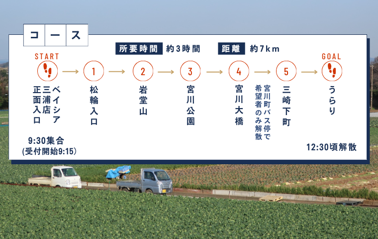 漁業とともに農業も盛んな三浦半島南部の田園風景を楽しみながら、約7キロの行程を歩くイベントです。