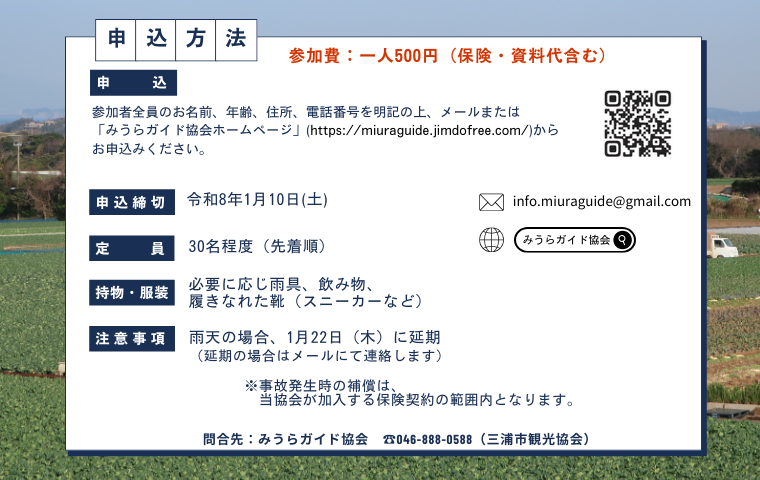 参加者全員のお名前、住所、電話番号を明記のうえ、メールまたは「みうらガイド協会ホームページ」からお申込みください。