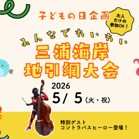 | 当日の流れ | 10:15~10:45 受付(セブンイレブン三浦海岸店前の砂浜テント) 11:00~ 開会の挨拶、コントラバスヒーロー登場! 11:15~ 地引網用に整列、地引網開始! 11:50頃 地引網終了、獲れた魚の抽選会 |