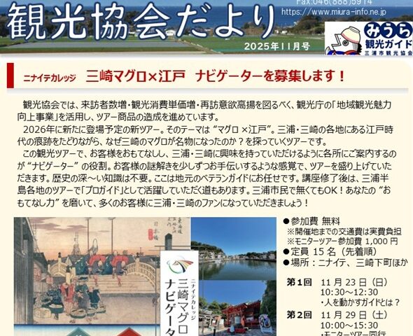 お知らせ・ニュース 協会だより 令和7年11月号 2025.11.2 Tweet Share 三浦市観光協会では、毎月1回【観光協会だより】を発行しております。令和7年11月号を掲載します。ぜひご覧ください。 協会だより-2025.11ダウンロード Tweet Share 投稿者: 一般社団法人三浦市観光協会 お知らせ・ニュース 第41回三浦国際市民マラソンエントリー開始! 前の記事